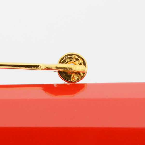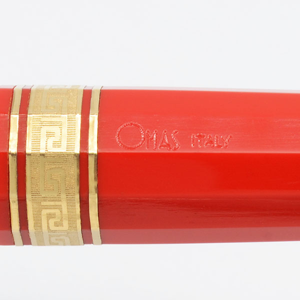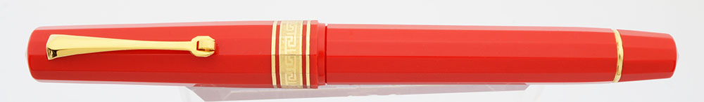 Color Red - bright orange-red natural cotton resin. The barrel and cap have gold trim and are 12-faceted. The cap band has a Greek pattern on it. There is a matching band around the section.
