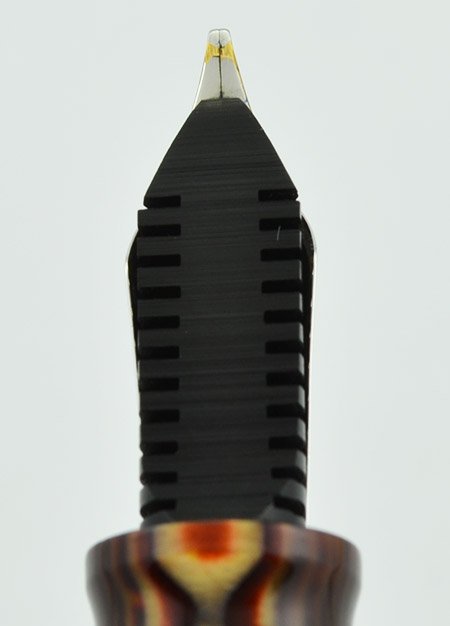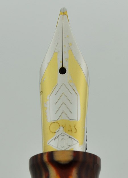 Nib 18k Medium Cursive Italic nib. The nib is springy and offers some line variation from flex but the tip of the nib was cut for additional line variation. The nib is labeled B and started as a broad but has a finer point now. The writing still offers broad lines but from the flex and not the tip. Please see the writing sample below. Some of the masking has come off of the nib but it won't affect writing.