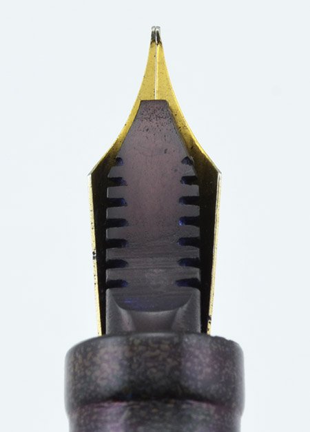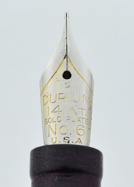 Nib Large #6 steel "Durium" fine nib is marked "14Kt Gold plate." It is not a high quality nib, but we've adjusted it and made sure it's smooth.
