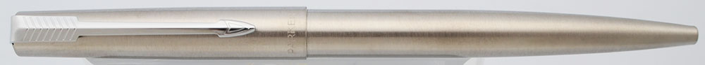 Color Monochromatic brushed steel cap and barrel with chrome plated arrow clip. Black disk on top of cap.
