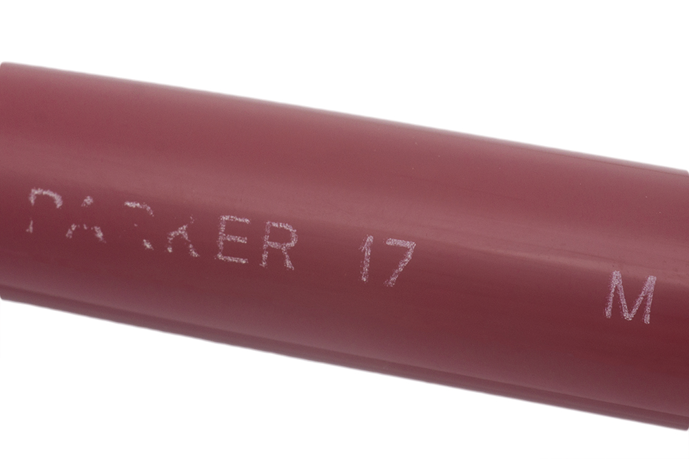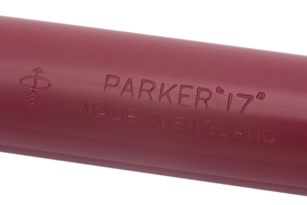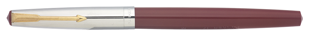 Color Dark red section and barrel; shiny chrome cap with a straight line pattern; gold plated clip; red jewel on top of cap. Original chalk mark on barrel noting "Parker 17 M".