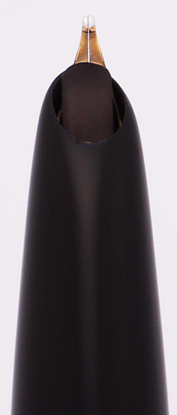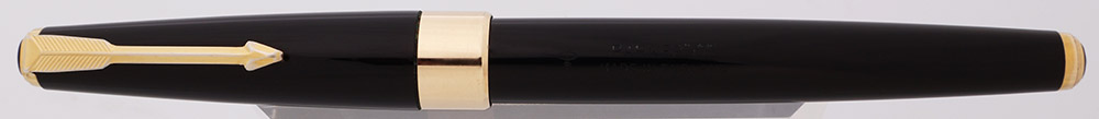 Condition Excellent + condition with no cracks, dents, or dings. This is a velvety black, shiny pen in a very lovely design. The barrel has very light signs of usage. The section has some small chips around the feed. The cap has light scratching, mainly under the clip. The wide cap band has some microscratching with two long, thin scratches. The clip has a few small scratches. The clip band looks great and the black jewel on top of the cap is perfect. The black jewel at the end of the barrel is rough. The imprints are very clear.