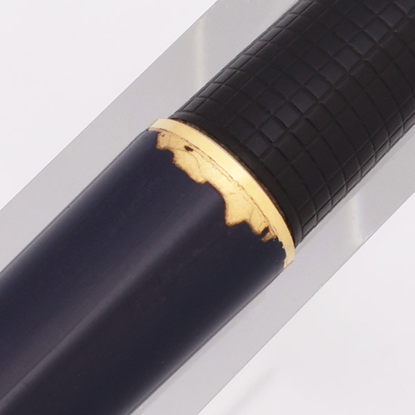 Condition Very nice condition for this dark blue, shiny pen, that has is slim and sleek. The cap and barrel have moderate scratching. The barrel lacquer is chipped just under the cap band and there's also a small arc of lacquer chipped off just above the end piece of the barrel, and there is some light chipping just under the tassie on the top of the cap. The clip and top tassie have light microscratching. There is some light plating wear along the top edge of the clip where it attaches to the tassie. The cap band looks good. The imprint is clear.