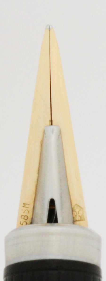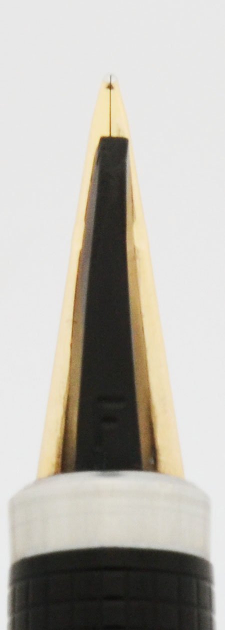 Nib FINE 14k nib. The Parker 180 nibs were meant to be reversible with two nib sizes. This pen is reversible but only has "F" written on the underside. This indicates that it writes like a Fine on both sides.