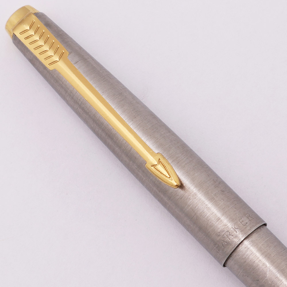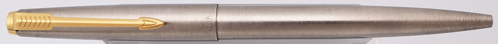 Color Brushed steel cap and barrel and smooth gold plated trim. It has a dimpled tassie.