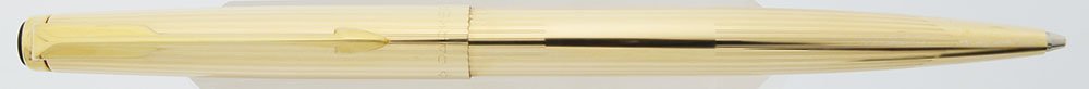 Color 12k gold filled pen. The pen has pairs of narrow lengthwise lines throughout with a blank cartouche area and a slanted smooth area to give the appearance of a pencil cone.