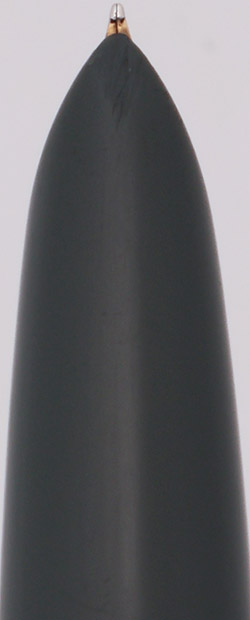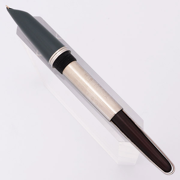 Condition Excellent condition for this shiny vintage pen in a classic design. The barrel has scratching and light signs of usage, but no cracks or chips. The section has moderate scratching from the cap lip. The cap has moderate scratching with some shiny marks caused by the end of the arrow clip. The clip has some microscratching, but no plating wear or brassing. The top pearlescent jewel has a small chip out of the edge, and light scratching on the surface. The imprints are faded, but readable.