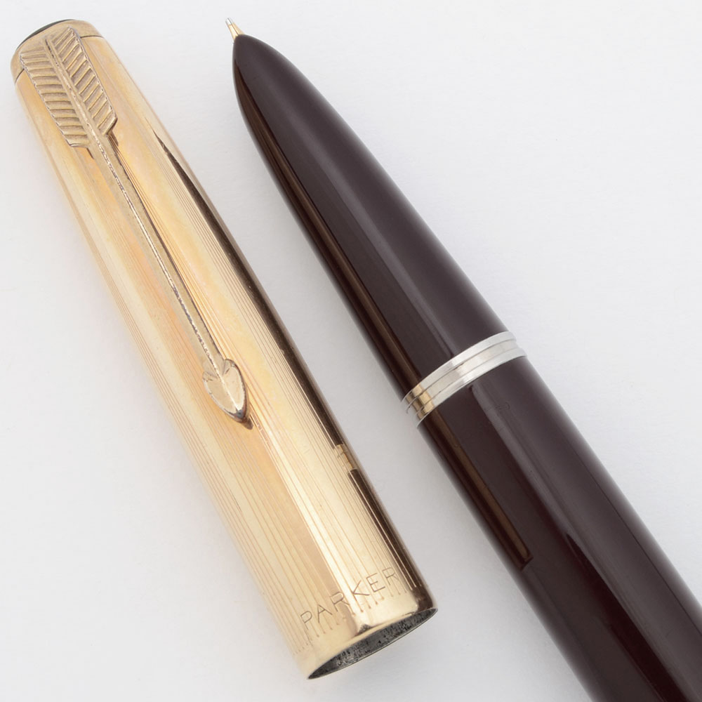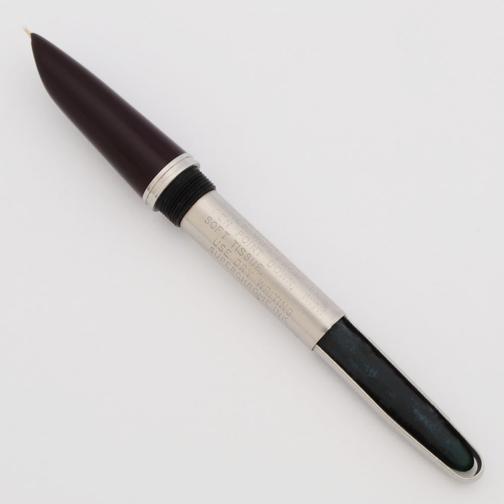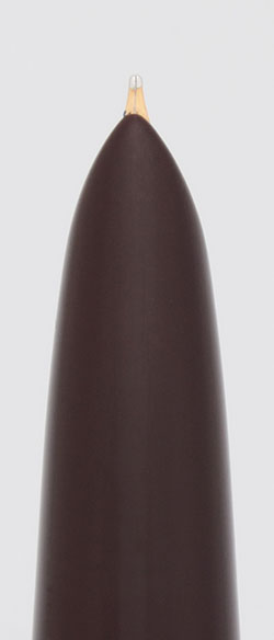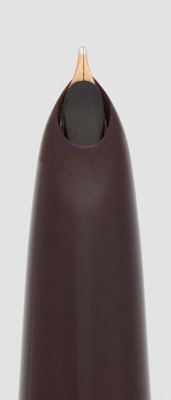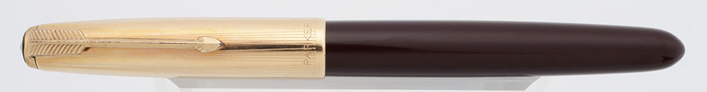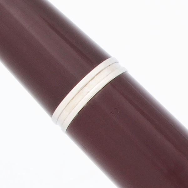 Condition Excellent condition. This is a small, shiny, and elegant pen in a sophisticated color pattern. The barrel has light wear -- it is deep burgundy with no signs of discoloration. There are some scratches around the end of the barrel. The cap has microscratching and some small dots of pitting, but no dents or dings. The clip has plating wear along the edges and some brassing at the top. The pearlescent jewel looks good. The imprint on the cap is clear. The imprint on the barrel is slightly worn, but still readable.