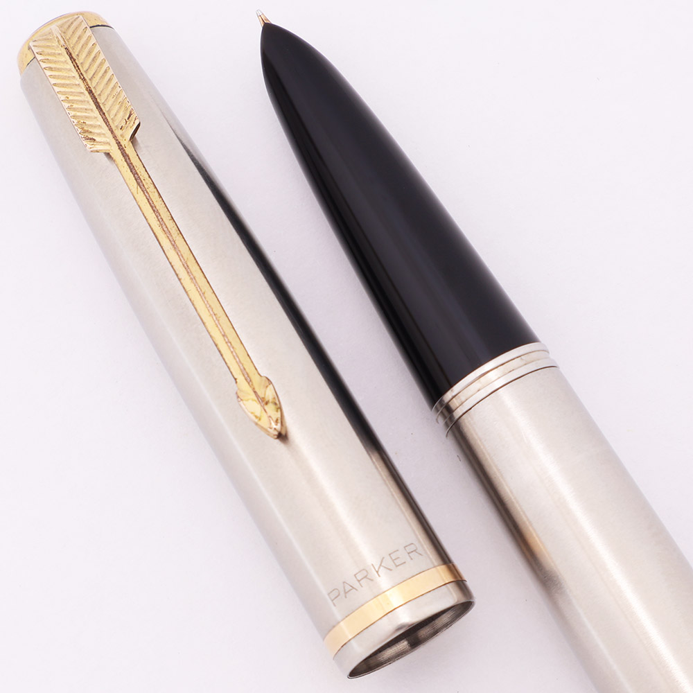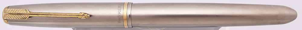 Color Brushed steel with "lustraloy" finish and arrow clips. For the fountain pen, the section is black. Gold plated trim, including a narrow cap band. The caps have a pearlescent cap jewel. The mechanical pencil has a unique cone at the end of the barrel that has concentric gold circles.