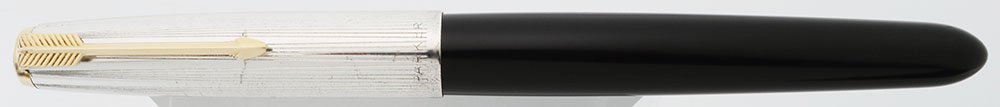 Color Black body with coin silver, or silver plated, cap. The cap has a converging lines pattern and gold filled trim. The cap is marked, "R. Silver." The cap has a 1-7/16" long arrow clip. Pearlescent cap jewel.