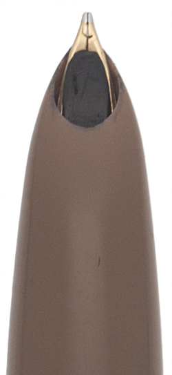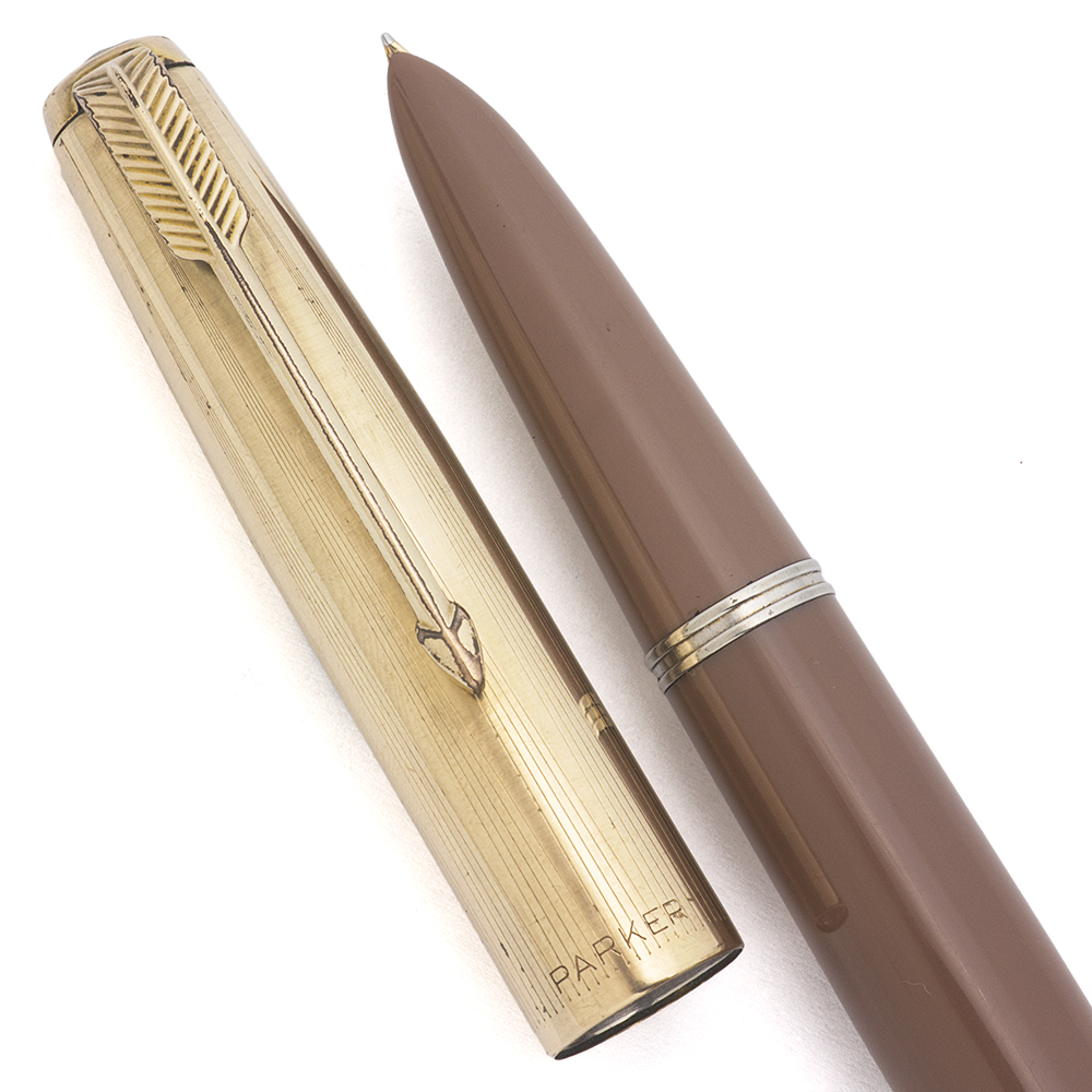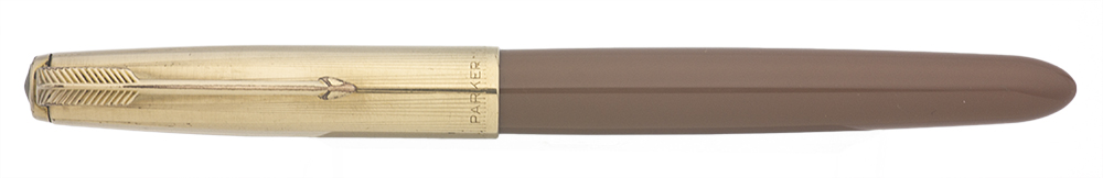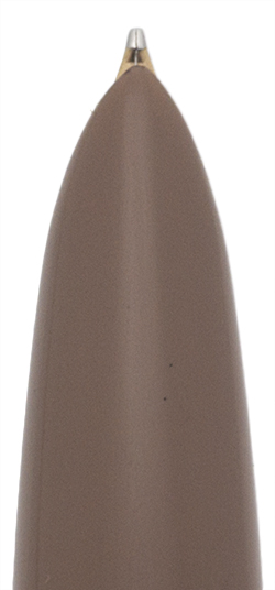 Color Cocoa. 1/10 12k gold filled cap with an arrow clip in a pattern of converging lines. Pearlescent cap jewel.