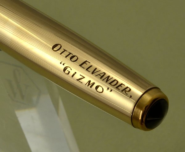 This high-end set is in excellent condition with only light signs of usage and handwear. The bodies are perfect and free of scratches, just very light handwear. The sac is very light in color. The caps are also excellent, with no dents or scratches or brassing. The pencil is perfect. Both pen and pencil caps are engraved boldly: OTTO ELVANDER "GIZMO" |