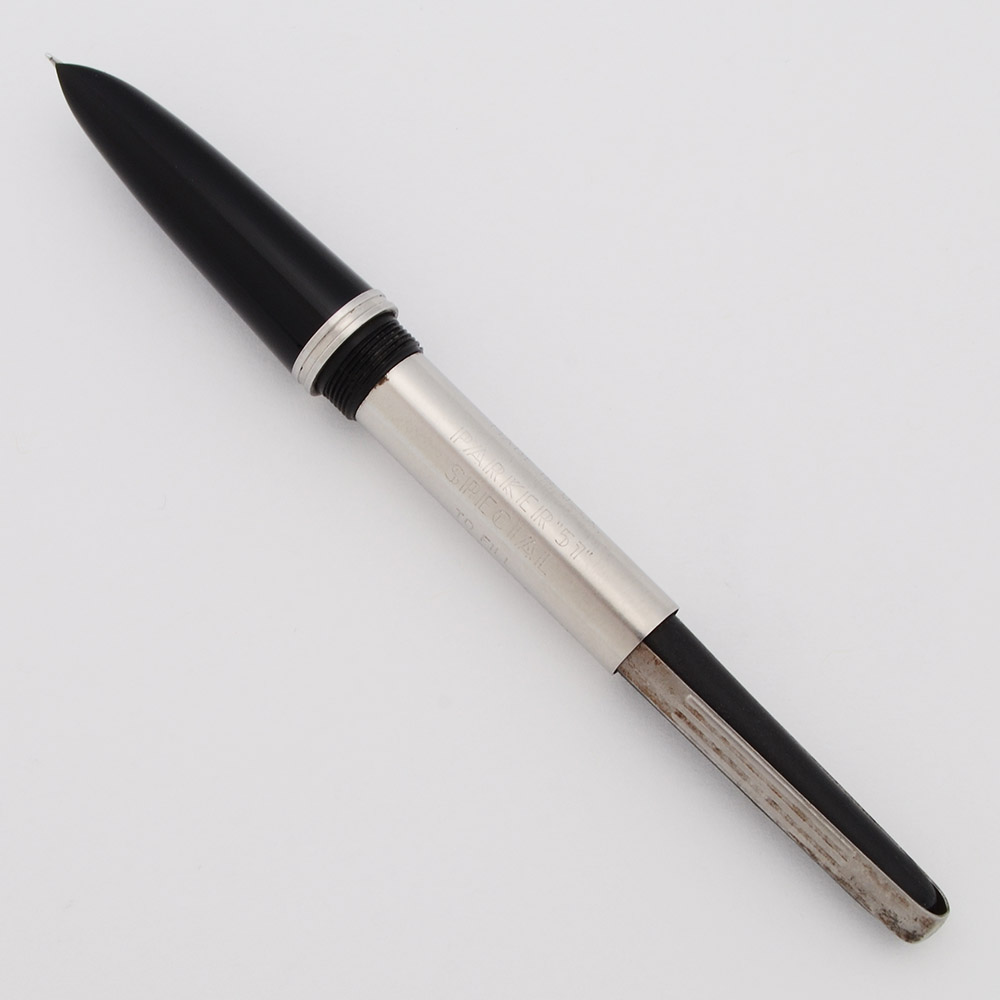 Product Name Parker 51 Special. It has a steel nib and a filling system marked "Parker 51 Special," but it has a cap that probably came from a standard Parker 51 in that it does not have the black jewel we normally see with the Special.