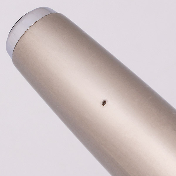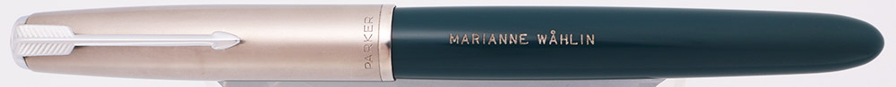 Condition Excellent condition with no cracks, chips, dents, or dings. The section has light scratching along the feed. The barrel has light scratching, and a personalization of "Marianne Wahlin". There is some pitting on the clutch ring. The cap has some short shiny marks and a few divots scattered about. The clip has microscratching. The clip ring looks great. The pearlescent jewel has some mottling and microscratching. The imprints are clear.