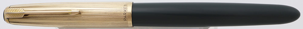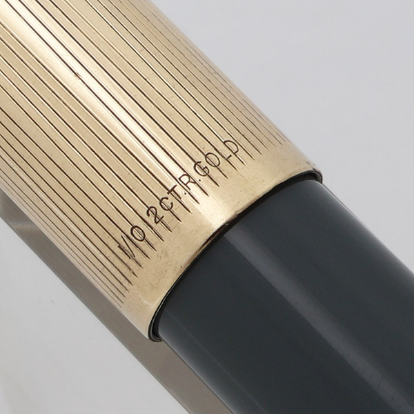Color Navy Grey body with a 1/10 12ct rolled gold cap in a pattern of converging lines with an arrow clip and a pearlescent cap jewel. The clip and tassie are one piece.