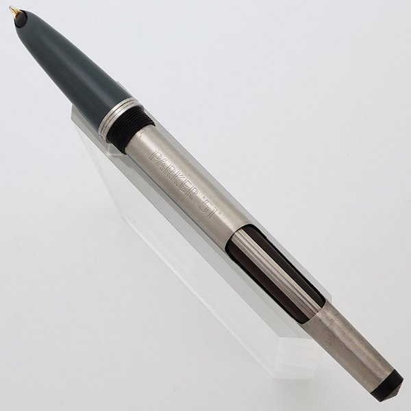 Condition Excellent + condition with no cracks, chips, dents, or dings. The barrel has mainly light scratching, most of it microscratching. The cap has light wear and scratching that somewhat dulls the surface appearance, and plating wear at the top where the lines converge. The cap lip has some small spots of plating wear. The clip has plating wear on the edges and high spots. The clip ring has brassing where the clip joins and around the jewel. The top jewel has some scratching. All imprints are clear.