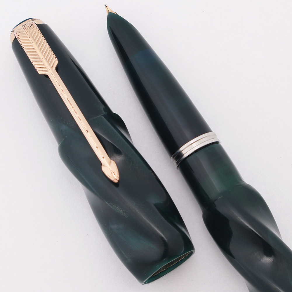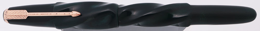 Condition Excellent condition with no cracks, chips, dents, or dings. This is a unique pen with deep swirls and some girth. The cap fits very snugly on the barrel. The section has moderate zigzag scratches all over. The barrel has light to moderate scratching. The cap has light scratching. The clip has light plating wear along the edges of the arrow and along some of the feathers. The clip ring has plating wear and a line of pitting along the top edge. The top pearlescent aquamarine jewel has surface ridges but these might not be scratches. There are no imprints.