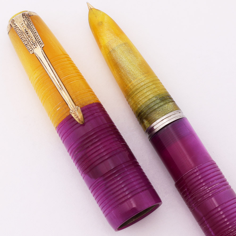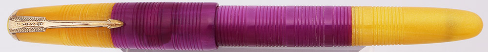 Color Two colors of acrylic, Clear Yellow and Purple, with a pattern of horizontal rings or lines carved into the surface. The bottom half of the cap and middle of the barrel are a purple acrylic, and the section, top half of the cap, and back end are clear yellow acrylic. The cap has the Parker inner clutch mechanism and a gold-filled arrow clip. Yellow cap jewel.