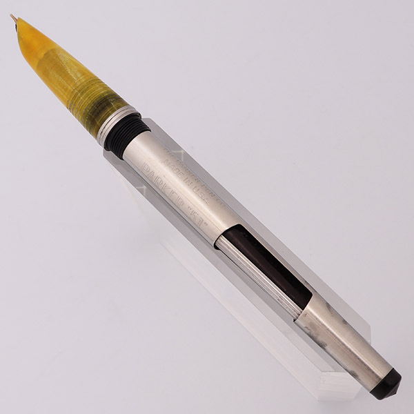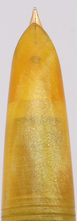 Condition Excellent condition with no cracks, dents, or dings. This is a uniquely colored and designed pen that is eye-catching. The cap and barrel look good with just some light scratching. The section has a few small chips around the feed. The gold clip and clip ring have a lot of plating wear. The yellow cap jewel has a crackled surface and darkening around the edge. The Parker imprint on the cap is clear. There are no other imprints.