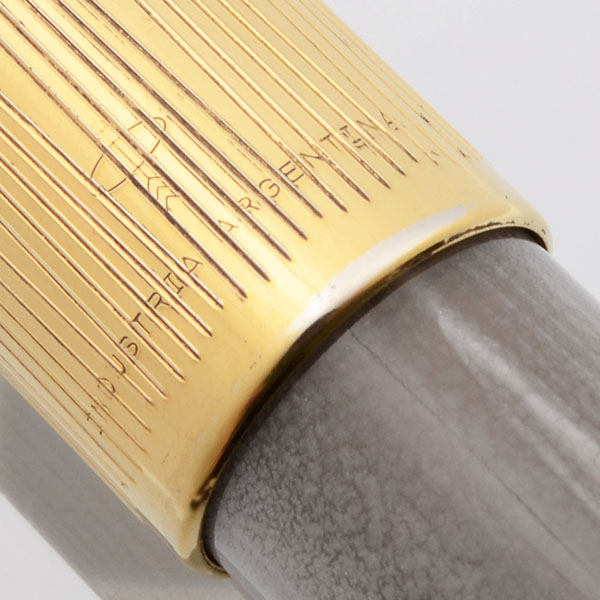Condition Excellent + condition with no cracks, chips, dents, or dings. This is a pearly grey satin-y pen with a shiny, glowing gold cap. The barrel is perfect. The section has scratches at the feed. The cap looks great with just light microscratching and a bit of wear along the cap lip where the gold plating is starting to thin. The clip has similar wear along the edges. The clip ring has some tarnish. The cap imprint including "Industria Argentina" is clear.