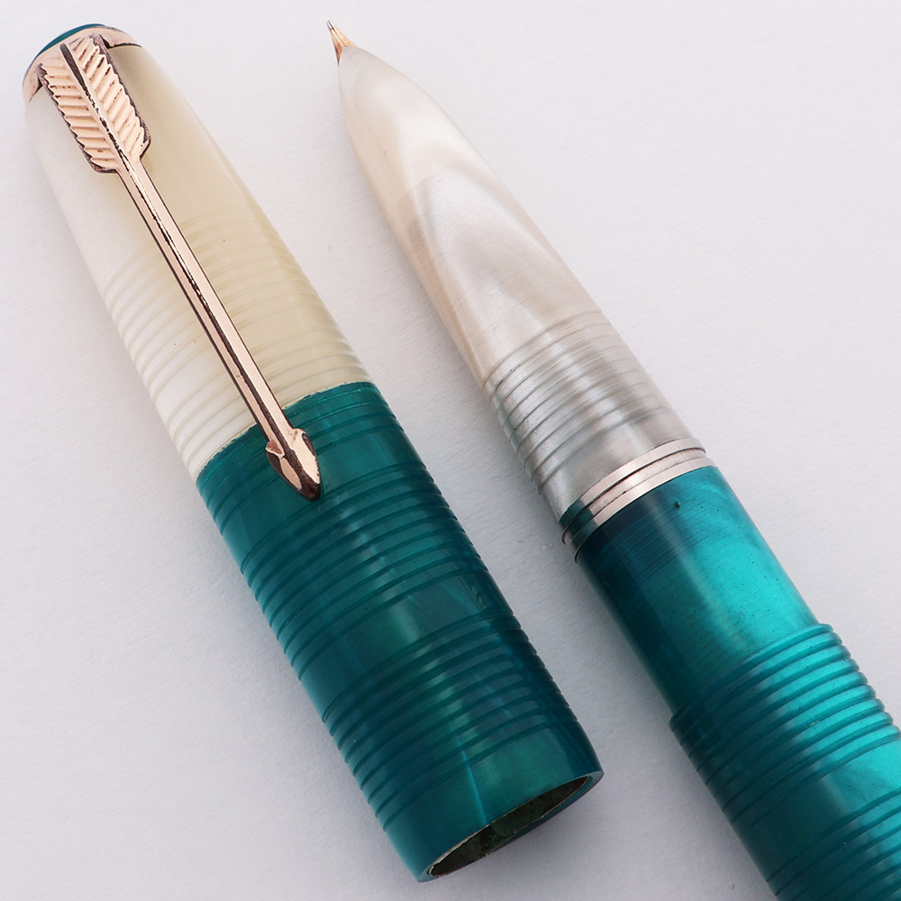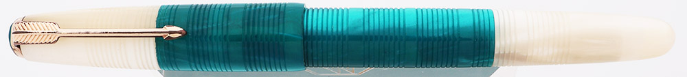 Color Two colors of acrylic, White and Teal, with a pattern of horizontal rings carved into the surface. The bottom half of the cap and middle of the barrel are pearly teal acrylic, and the section, top half of the cap, and back end are pearly white acrylic. The cap has the Parker inner clutch mechanism and a gold-filled arrow clip. Teal pearly cap jewel.