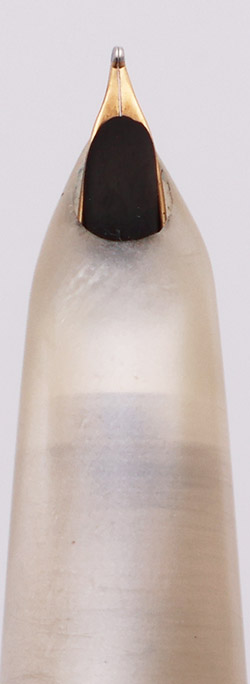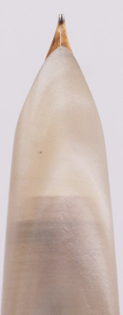 Condition Excellent condition. Light handwear and microscratching, though this is largely camouflaged by the pearly character of the material. The clip has brassing and plating wear on the high edges. There is also plating wear and pitting around the cap jewel. Cap jewel is the same teal as found elsewhere on the pen, and looks great. There are no noticeable ink stains on the material.