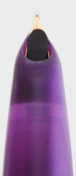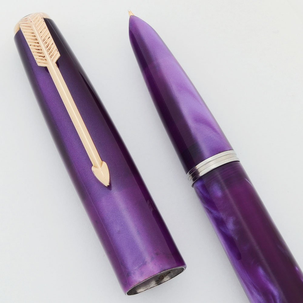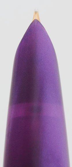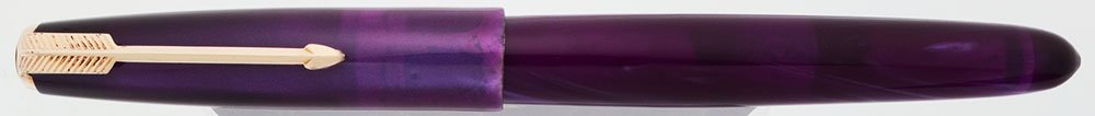 Color Purple pearlescent barrel, hood, and cap with a gold filled arrow clip and a pearlescent cap jewel. The material used for the body has a lot of chatoyance.