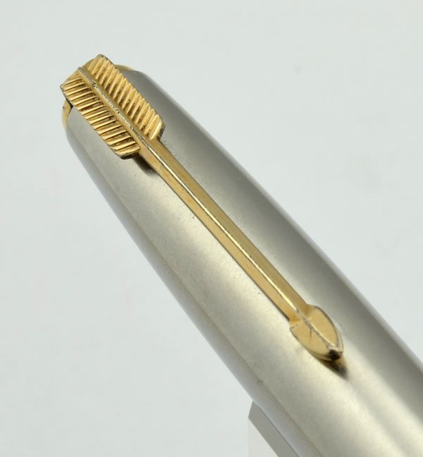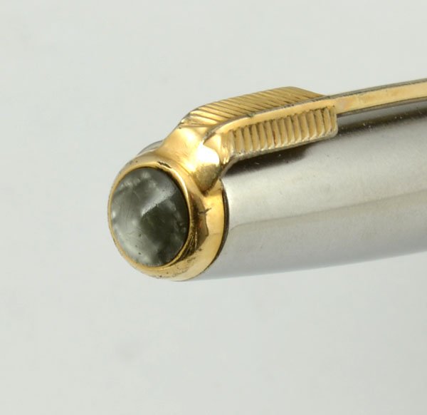 Color Brushed stainless steel finish to cap and barrel, gold filled trim with arrow clip. Pearlescent cap jewel. Gold ring on cap.