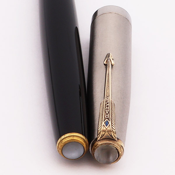 Condition Excellent condition with no cracks, chips, dents, or dings. This is a velvety, shiny black pen. The section and barrel look great with just some light scratching, a bit more on the section than on the barrel. The cap is very solid with a visible brushed texture. There are a few longer scratches and some microscratches but overall it is excellent. The clip has plating wear on the arrow end, and the blue diamond has some chipping on the corners. The clip ring has plating wear and pitting, this is the oldest part of the pen and it shows the most wear. The top cap jewel is missing an arc of material and has a small gap on one edge where it does not touch the clip ring (see photo below). The pearlescent jewel on the end of the barrel looks beautiful. The Parker imprint on the clip is clear. There are no other imprints.