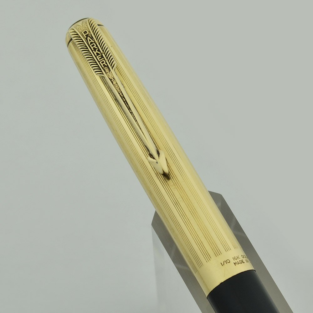 Color Cedar Blue barrel with a 1/10 16k gold filled parallel lines cap in a pattern of groups of 4 even lines up it, with gold plated trim and a pearlescent cap jewel and a split arrow clip.
