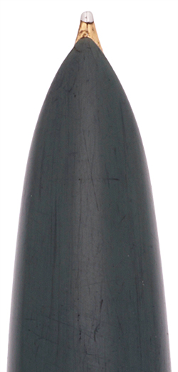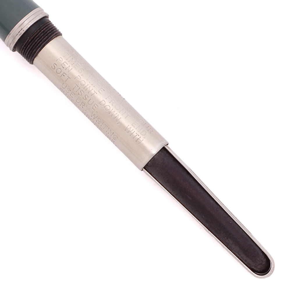 Condition Excellent condition. The cap has a fair bit of scratching - the 51 Specials had shiny caps, but this one more closely resembles Parker's Lustraloy finish (the black jewel does mark it as a 51 Special cap). The section has a lot of lengthwise scratches from capping, and some light staining. There are some tiny dots of pitting on the clutch ring, but it still functions very well. There is a horizontal mark caused by the end of the clip. The clip looks great, with no brassing or plating wear. The clip ring has a few little dots of plating wear. The black top jewel has some scratching and paint missing from the very top and around the edge. The imprint on the cap is clear.
