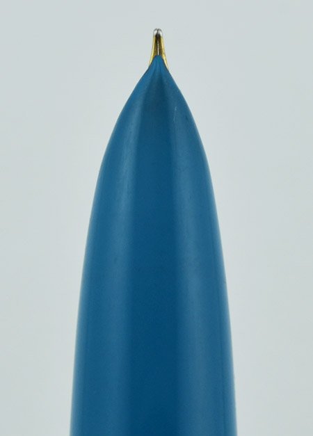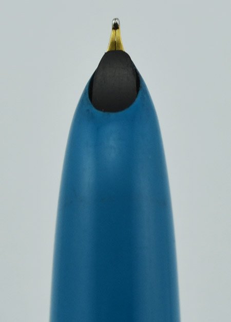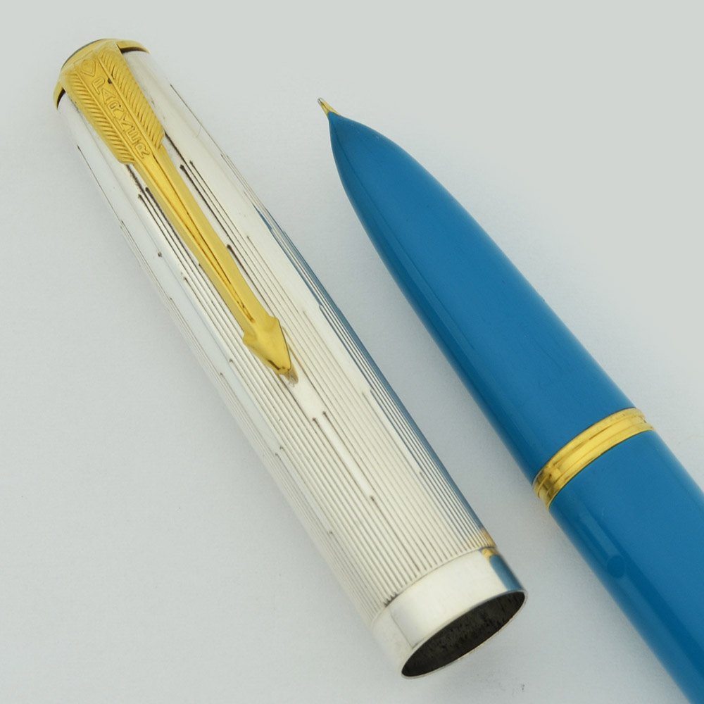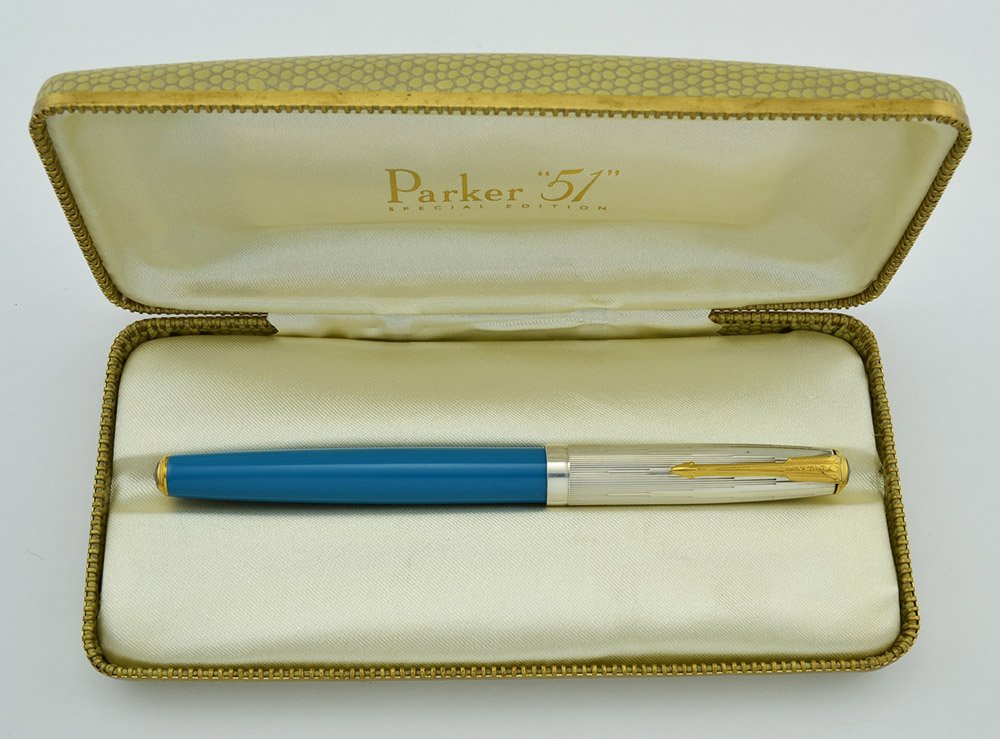Color Bright blue barrel called Vista Blue. The photographs make the pen looks less aqua like than the blue is. The sterling cap is etched with a design reflecting the shape of the Empire State Building. Also known as the Icicle design. It has pearlescent cap and barrel jewels and 23K trim including the classic blue diamond parker clip.