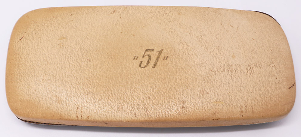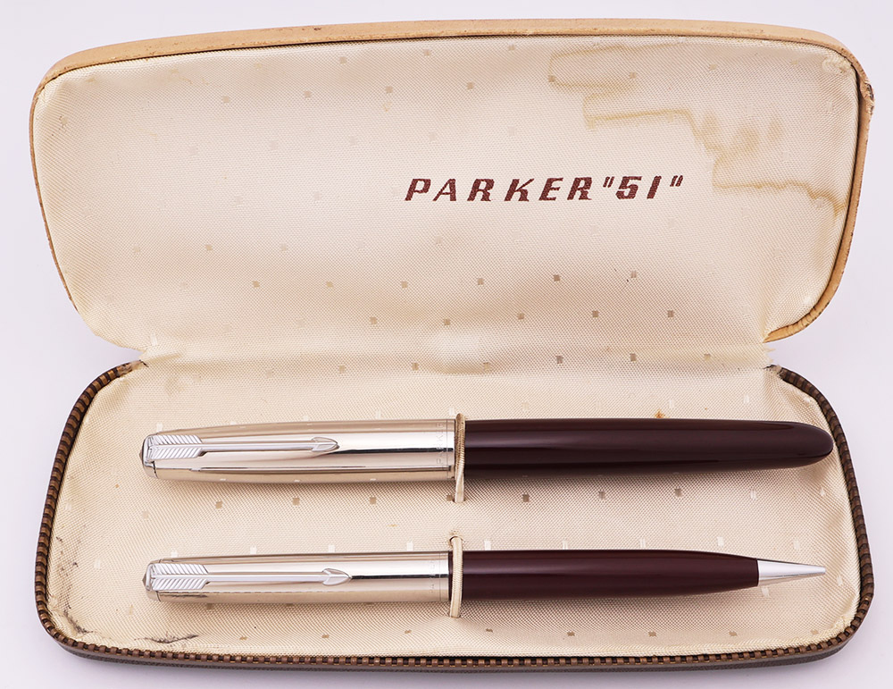 Condition Excellent + condition with no dents or cracks. The fountain pen has light handwear and scratching. There are some marks on the section from the cap. The end of the barrel has some light posting marks. The cap has microscratching all over that slightly dulls the appearance. The clip looks great, with no brassing or plating wear; the pictures show some very slight residue in the "feathers" at the top, but it's not any sort of damage to the plating. The clip ring does have some touches of pitting along its bottom edge. Cap jewel is perfect. The mechanical pencil has light to moderate microscratching all over, and the cap jewel has some small surface marks. No brassing or plating wear anywhere. The imprints are all clear. Ships in Parker 51 box. The box has some light staining inside, and small marks on the outer surface, but overall looks great.
