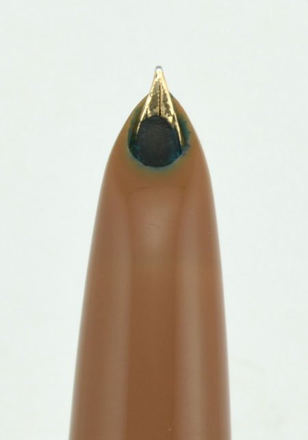 Excellent! The body is very good looking, and it has been nicely polished though you can still see light scratches. The imprint is readable and quite clear. The tassies are very good with no brassing, and the barrel jewel is excellent. The cap jewel, when viewed with some magnification, looks like the edges have been nibbled, and the jewel shows some cracking under the surface, so we suspect someone tried to remove it. (It undoubtedly can be replaced, but we didn't have any handy.) The cap itself is free from dents, though there are one or two small marks, as well as general hand/desk wear. There is a bit of color disparity between the barrel and the blind cap. The plastic on the tip of the hood is a slightly darker color about 1/2 inch from the nib. There is some staining under the nib around the feed. All these things can be clearly seen in the photos. We restored the filling system, we have tested the pen and will fully guarantee it will work as it should. |
