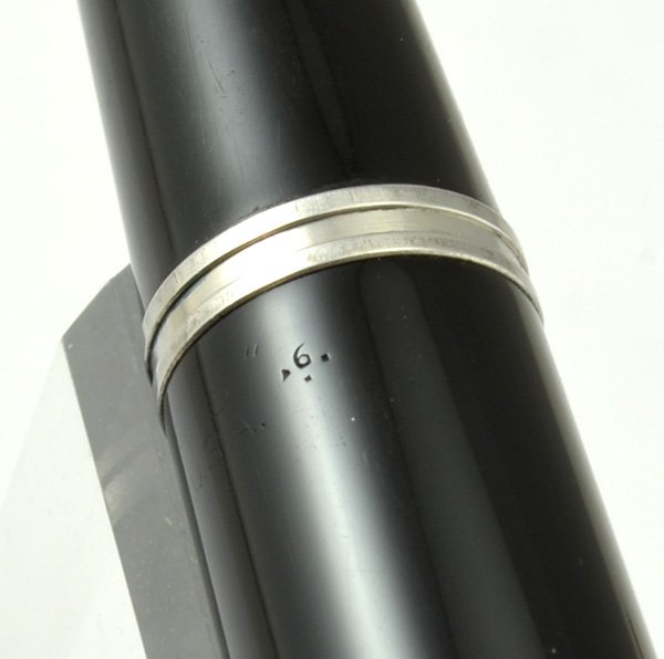 Very nice condition, a little better than user grade. Though the cap doesn't have any dents, there are tiny dots of pitting and wear, especially where the lines converge at the top of the cap (see photos). The body has some minor scratching on it, and part of the blind cap is a little lighter in color. The section has some scratches caused by the cap. Overall the pen has a lot of handwear, but the nib is excellent and shows only a little wear. It's fully restored and tested. |
