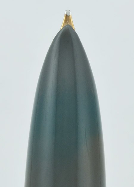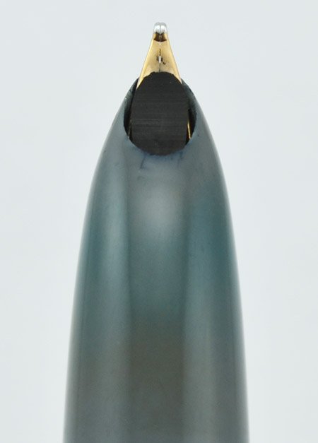 Condition Excellent condition. Some handwear on the barrel. The cap looks great with only a few light marks, nothing we'd classify as a dent. The hooded nib section has two bands of discoloration in the middle and some scratches at the end beneath the feed. The clip has some brassing along the edges and underneath. There is a small area with scratches that might be a tool mark on the cap just below the tassie ring.