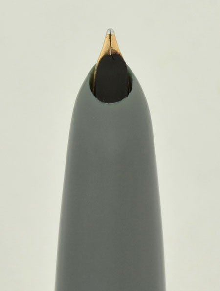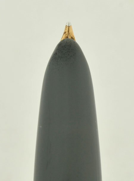 Condition Excellent plus working example of the classic Parker 51 Vac. There are only a few light shiny marks on the cap, though it is almost perfect with no dents or dings. The body is excellent and very shiny. There are a few tiny tiny dark flecks of staining toward the tip of the shell, which we tried to photograph. Easy to read imprint.