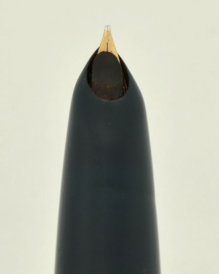 Color Cedar blue body, Gold filled (1/8 14k in a pattern of close parallel lines) cap, Arrow clip (correct for 1947). Pearlescent cap jewel.