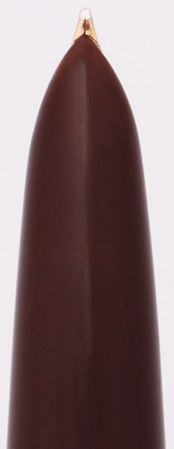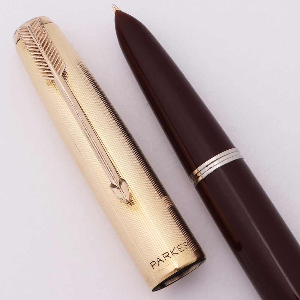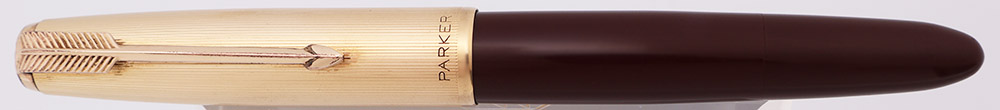 Color Cordovan Brown body, 1/8 14k gold filled cap with a pattern of parallel lines. Pearlescent cap jewel.
