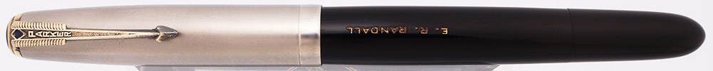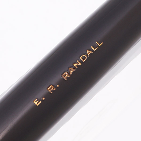 Color Velvety black body and Lustraloy cap. Pearlescent Cap Jewel. Gold plated blue diamond clip. The barrel has a personalization: "E.R. Randall".