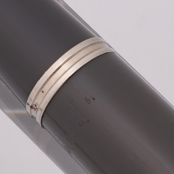 Condition Excellent condition with no cracks, chips, dents, or dings. This is a shiny pen in a classic color scheme and with a uniquely designed cap band. The section has heavy scratching caused from capping. There's a bit of corrosion on the clutch ring. The barrel has light scratching. There are some small, melty "burn" marks on the blind cap. The cap has light scratching and some shiny marks. There are some tiny dots of corrosion around the cap lip. The clip has plating wear and some pitting all over. The clip ring has plating wear. The pearlescent cap jewel has some small scratches. The imprints including the date code are clear.