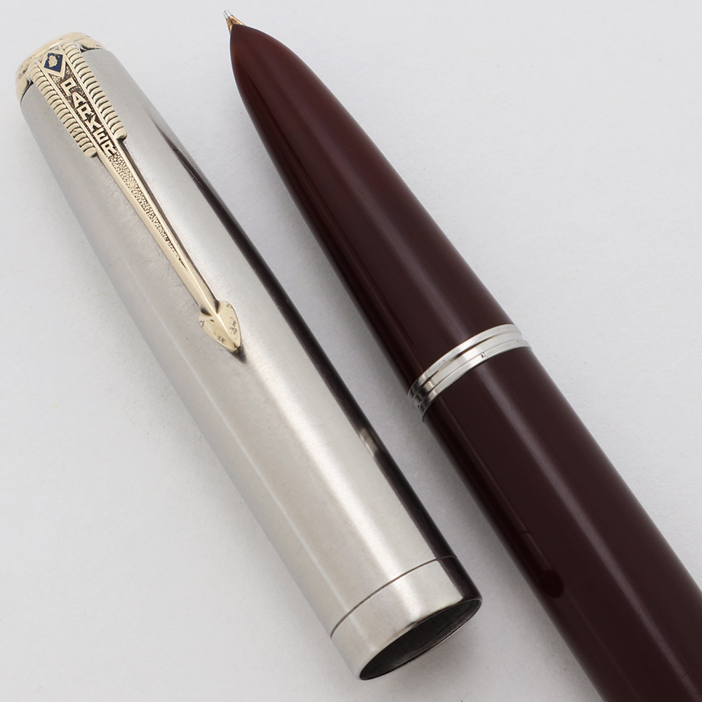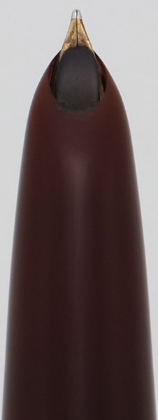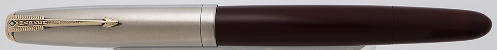 Color Cordovan Brown barrel and section, Lustraloy steel cap. Pearlescent cap jewel. Gold arrow clip.