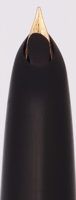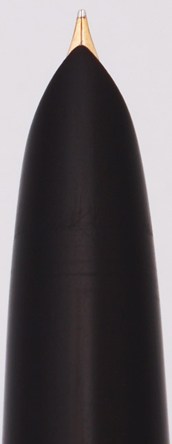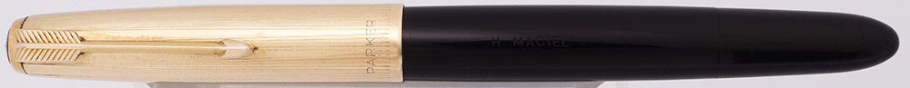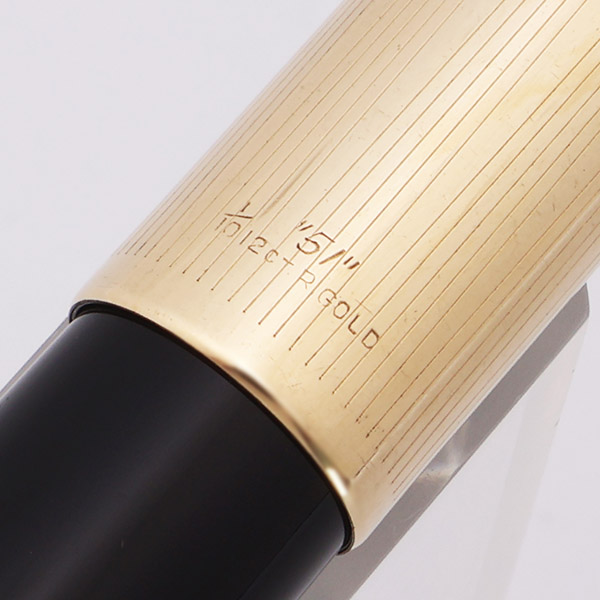 Color Black body with a 1/10 12k rolled gold cap. The cap has a pattern of converging lines and a pearlescent cap jewel. The clip is in the shape of an arrow (one of the "transitional" clips you see from 1947 and 1948).