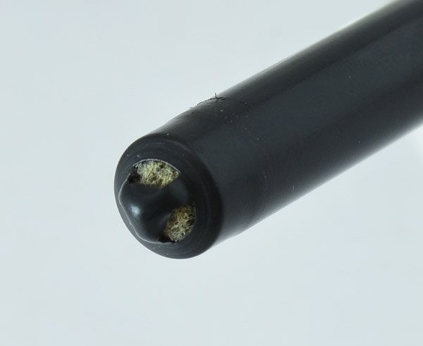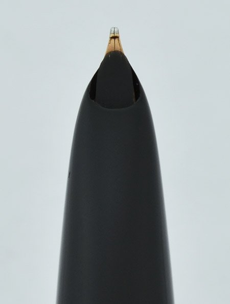 Here is how you fill a Parker 61, and an insight into how the pen actually works. Unscrew the barrel and stick the back end of the pen (aka the capillary cell) into a bottle of ink. Wait a few minutes (probably more like a half hour when you first start one of these older used ones), and let the ink wick up into the capillary cell. The cell contains a sheet of perforated plastic that has been given a 3-D pattern resembling tire tread, and rolled up. The perforations allow ink to seep between the rolled-up layers, and the tread pattern maintains space between the layers. In the middle of this tube, which runs the entire length of the capillary cell, is the feed. To keep things clean, the capillary cell has on a coating of teflonon the outside that is intended to shed ink as the user withdraws the pen from the ink bottle, leaving very little ink to be wiped off. The end of the barrel contains a spring-loaded thingey which covers the open end of the capillary tube, but still allows it to vent.