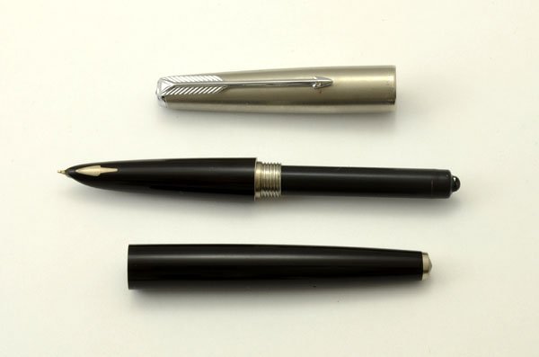 A word or two about the Parker 61 Capillary Filling System. If you are not familiar with this unique design, you should read this | Here is how you fill a Parker 61, and an insight into how the pen actually works. Unscrew the barrel and stick the back end of the pen (aka the capillary cell) into a bottle of ink. Wait a few minutes (probably more like a half hour when you first start one of these older used ones), and let the ink wick up into the capillary cell. The cell contains a sheet of perforated plastic that has been given a 3-D pattern resembling tire tread, and rolled up. The perforations allow ink to seep between the rolled-up layers, and the tread pattern maintains space between the layers. In the middle of this tube, which runs the entire length of the capillary cell, is the feed. To keep things clean, the capillary cell has on a coating of teflonon the outside that is intended to shed ink as the user withdraws the pen from the ink bottle, leaving very little ink to be wiped off. The end of the barrel contains a spring-loaded thingey which covers the open end of the capillary tube, but still allows it to vent. |