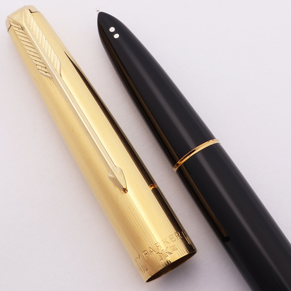 Color The barrel and section are shiny black. Gold lined cap, probably gold plated. Double black jewels on either end of the fountain pen.