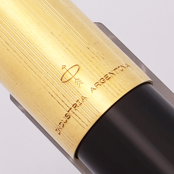 Condition Excellent condition with no cracks, chips, dents, or dings. This is a shiny, elegant pen with a pattern of grouped lines on the cap. The cap has a few scattered dots of pitting. The clip has small dots of pitting in the feathers. The black jewels look excellent. The imprints, including "Industria Argentina" are clear.