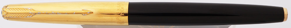 Color Black barrel and section with gold cap that has a repeating pattern of six lines and a space. Gold arrow clip. Double pearlized jewels on either end of the fountain pen.
