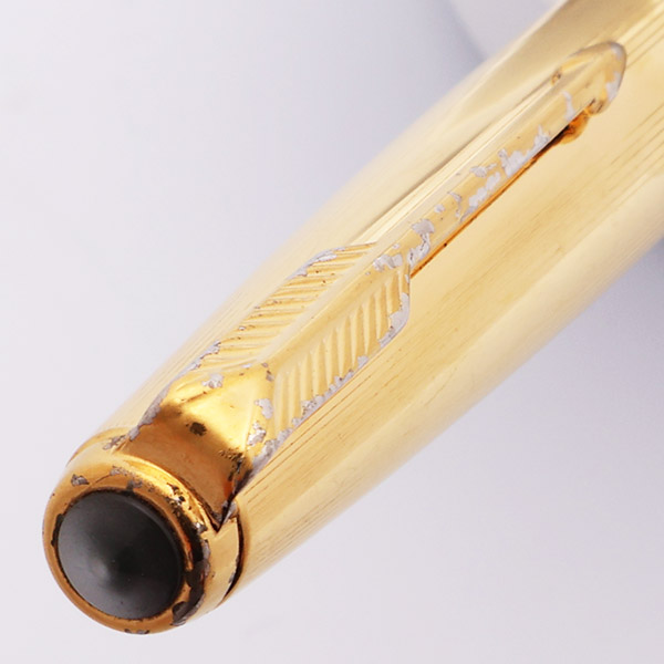 Condition Excellent condition for this velvety black, shiny pen with a glowing gold cap. This is a sophisticated, elegant looking pen. The barrel and section have light scratching and look great. The cap looks great with no dents, but the clip, and clip ring have significant plating wear or flaking (see photo below). The pearlescent cap jewel looks excellent. The pearlescent jewel at the end of the barrel has some tiny dot scratches at the peak. The imprints, "61 Parker 60 MKIII, Industria Argentina" on the cap are clear.