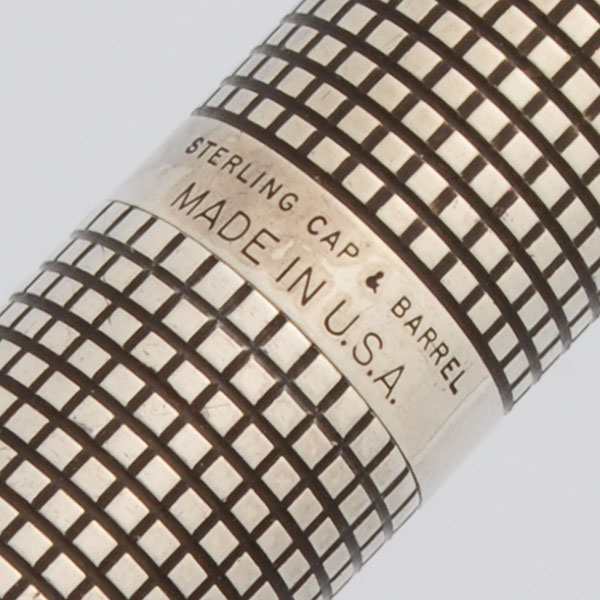 Color Sterling silver cap and barrel with gold plated trim. It is the cisele, or grid pattern with 22k electroplated trim. It has dish tassies. The trim band is marked "Sterling cap and barrel."